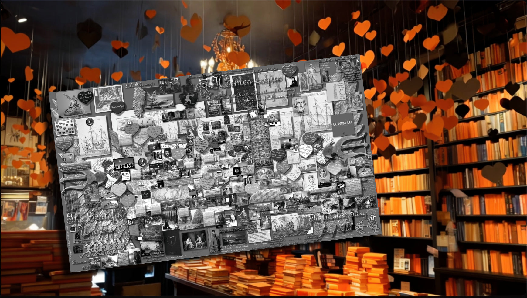 And so this is the arrival of the Homeric epics through the living lineage of Hermes to the coast of California, 2019 and those cosmic happenings. It is an artistic documentation of the interweaving "tapestry" or scroll of detailed experience of Shiloh's writing on-line to John Mayer depicted in Until Shiloh Comes Cosmic Flow Tapestry (2018) and the books Coyote Weaves a Song: A Mythological Song from the Beginning of Time that were written to the members of Dead and Company, even before their formation.