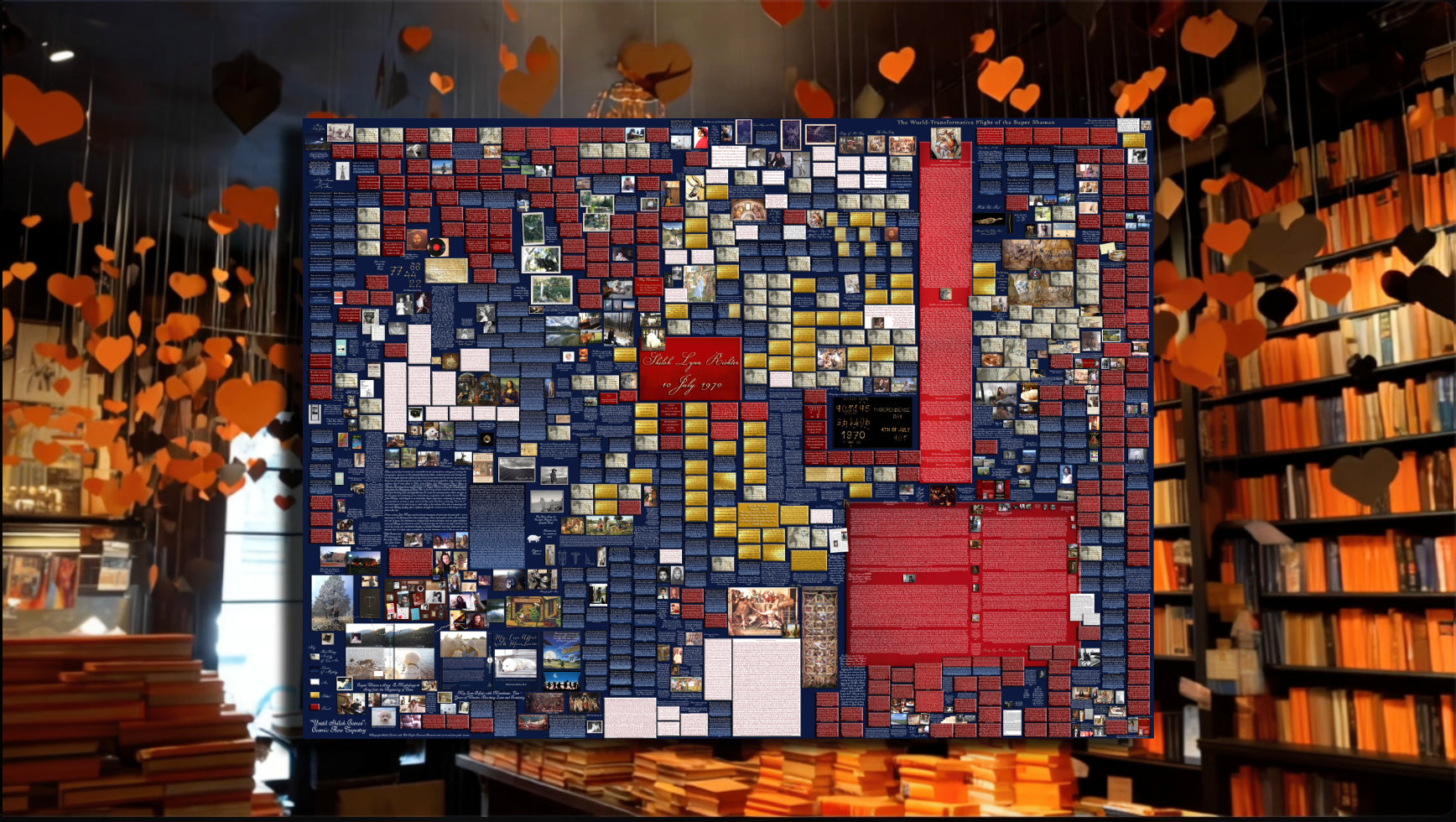 The tapestry is the eternal weave shown in the books Coyote Weaves a Song: A Mythological Song from the Beginning of Time, Volumes I and II and My Love Affair with Moonbeam: Ten + Years of Wonder, Bursting Love and Creativity.